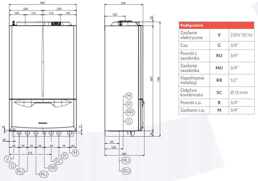 Kocioł ma kompaktowe wymiary: 748 × 440 × 260 mm, co ułatwia montaż nawet w ograniczonej przestrzeni.