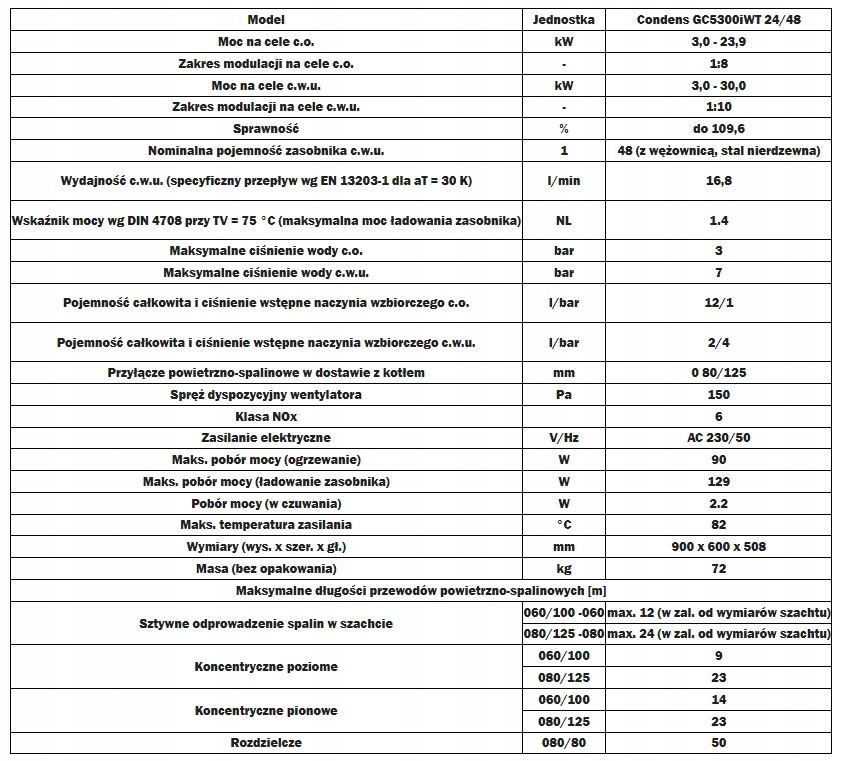 - Przyłącze spalin: 125 mm (powietrze/spaliny: 80 mm)