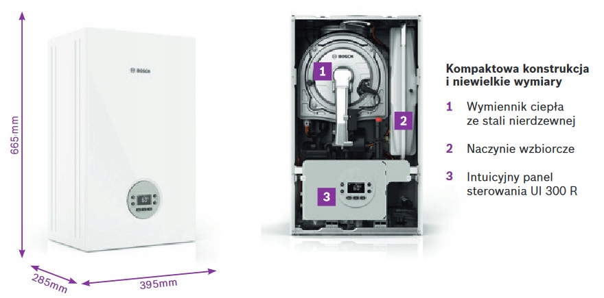 Serce urządzenia stanowi nowoczesny wymiennik ciepła ze stali nierdzewnej, który zapewnia długą żywotność oraz wysoką odporność na korozję. Komponenty zostały zaprojektowane zgodnie z rygorystycznymi normami jakości Bosch, co przekłada się na trwałość i bezawaryjność.