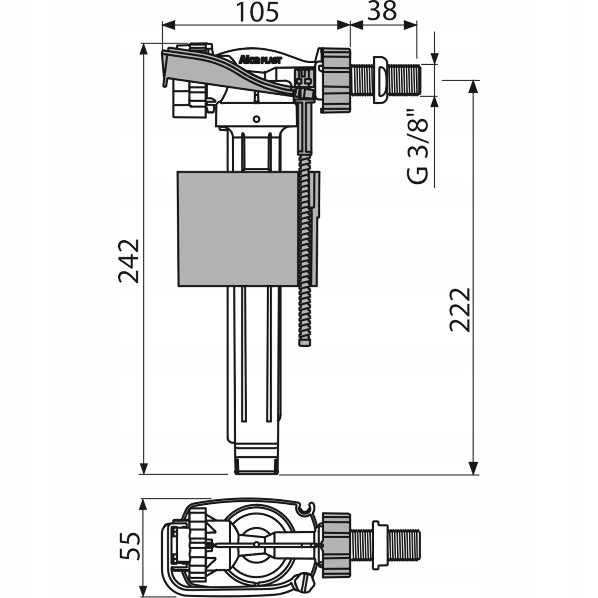 Zawór napełniający boczno zasilany (zbiorniki ceramiczne) Producent: Alcaplast Kod produktu: A150-3/8″ Opis produktu: Zastosowanie Do montażu z boku zbiornika Do wymiany Uniwersalny zawór do spłuczki ceramicznej Specyfikacja Mała…